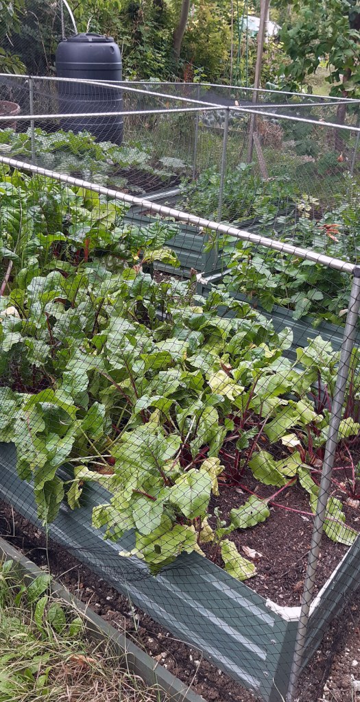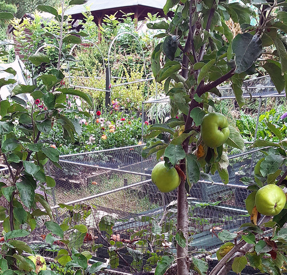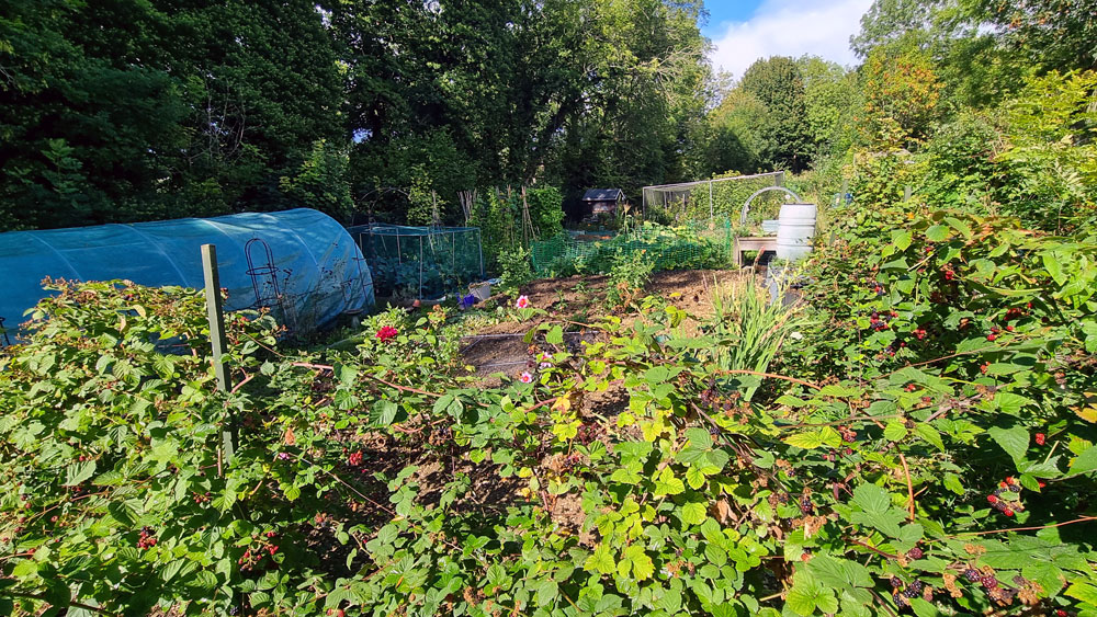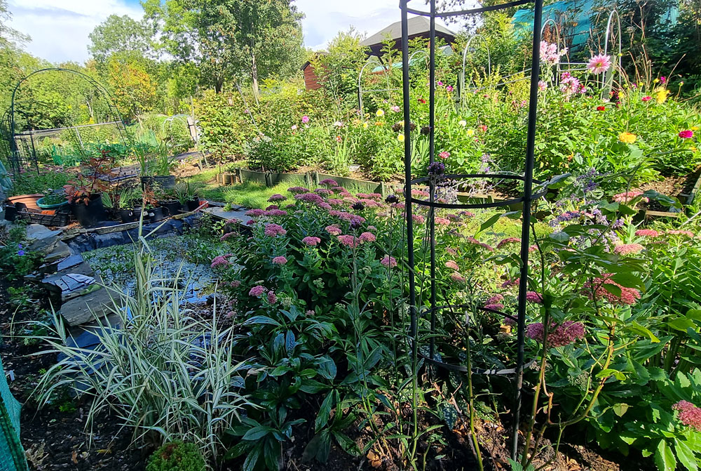 There is an interesting mix of fruit, flowers and vegetables divided into sensibly sized growing areas. There is a lot happening on the plot, but good balance is maintained with the use of clearly defined cultivation beds and nicely edged paths between the beds. There is a wildlife pond, so a feast for lots of little creatures as well as a feast for the eyes of human visitors. Good use of netting for plant protection and support. There are different types of netting in use to suit the needs of different types of plants. Some careful cultivation around trees. There is good weed management. You can sense the enjoyment the plot holder is getting from her plot. Congratulations to Helen.