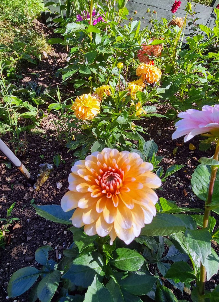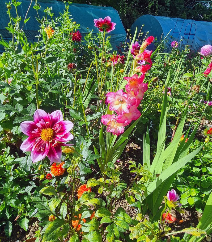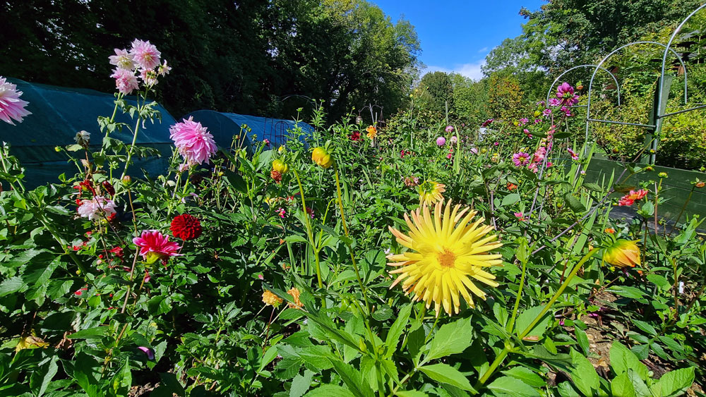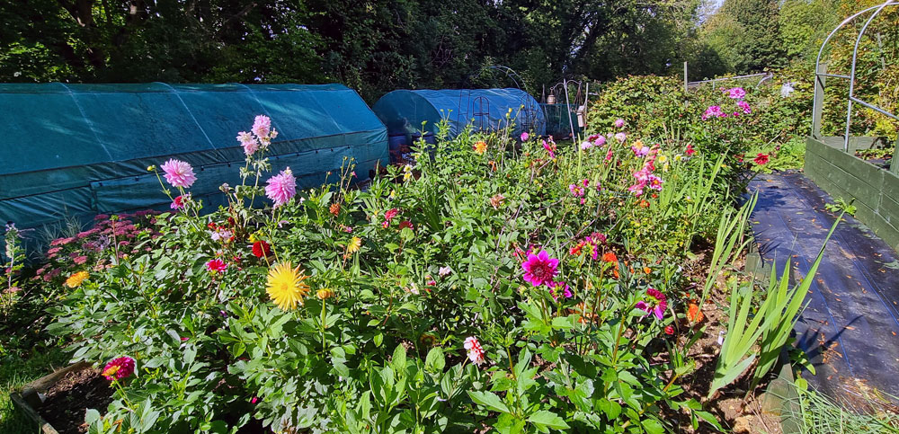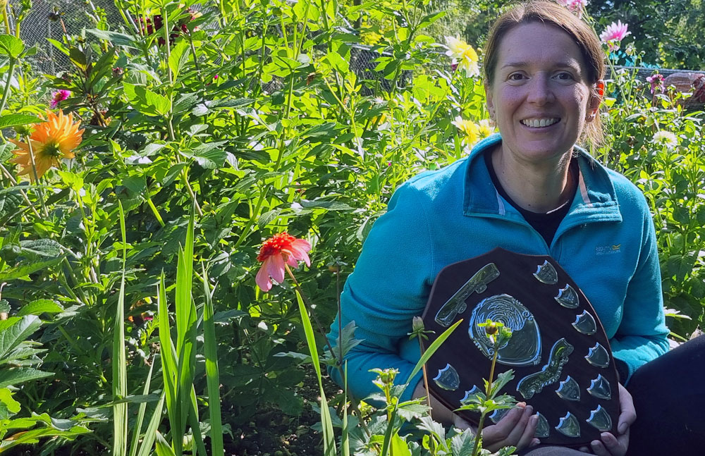 The Plot Holder of The Year 2025 is Helen (Plot 31A, B, C). Here she is surrounded by some of her famed dahlias.