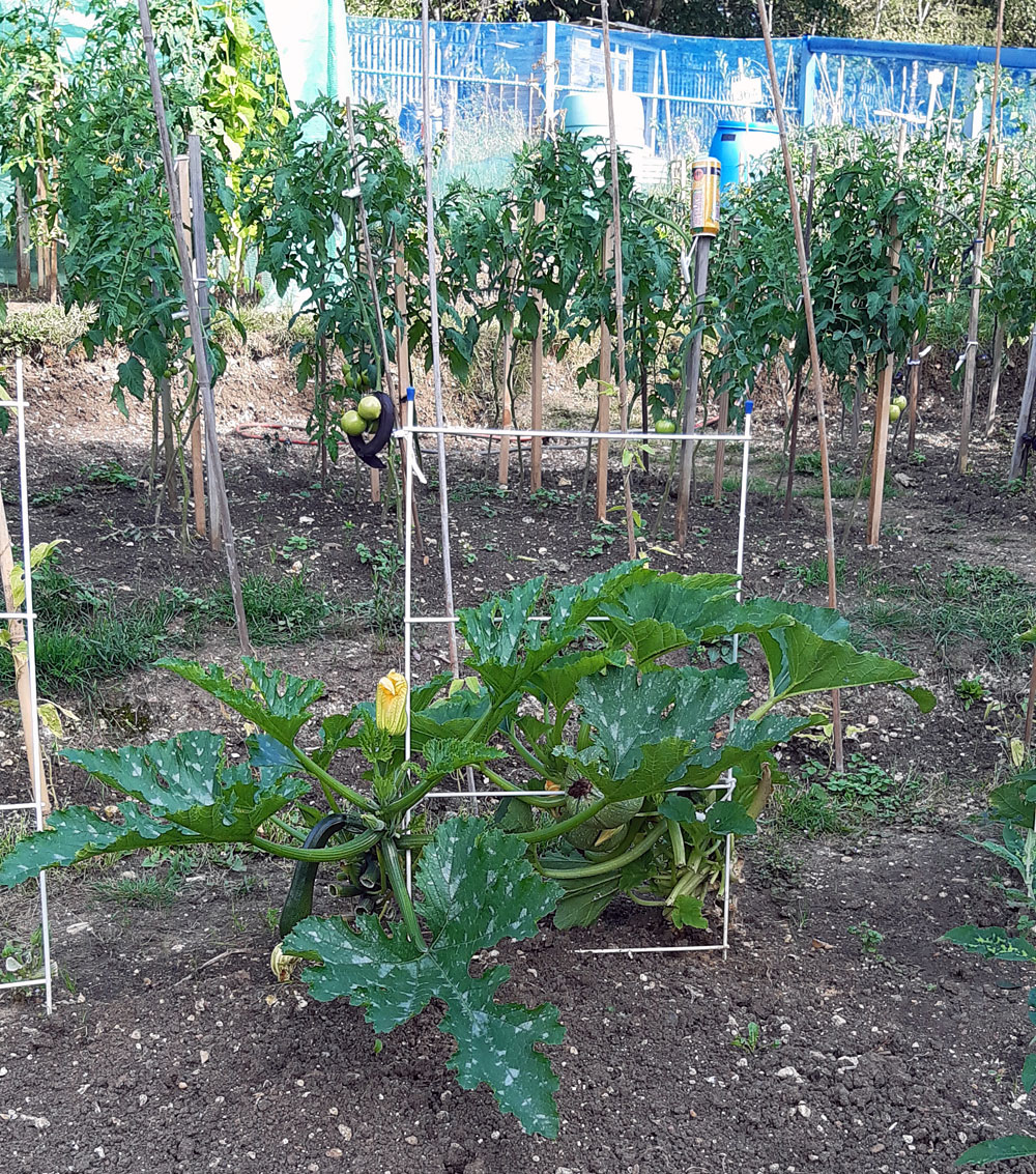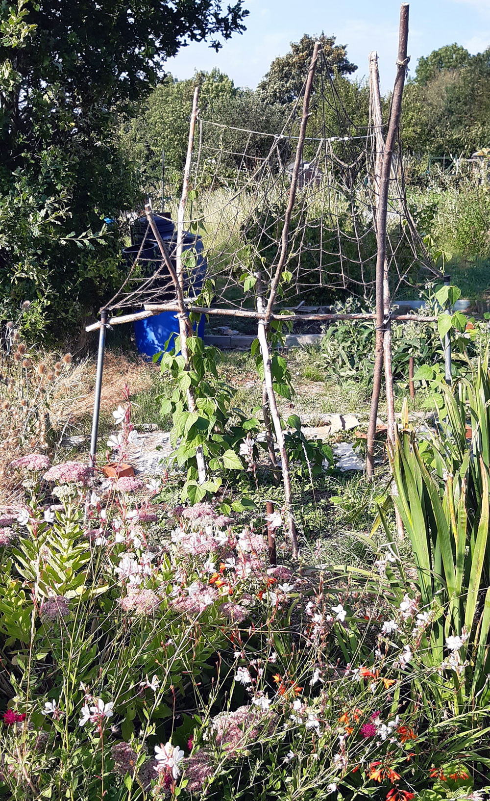 There are quite a few bamboo cane wigwams, some people call them teepees, on the site supporting various kinds of climbing beans. Helen has a very attractive wigwam cluster for different types of beans. Deserves a prize for variety.